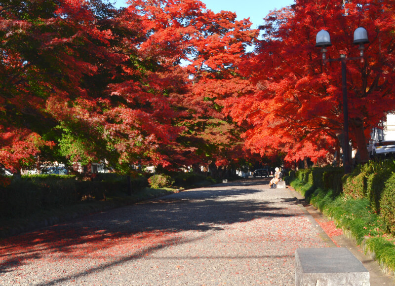 参道西側は、大山公園となっており、植栽されたモミジ並木は秋には美しく紅葉します。